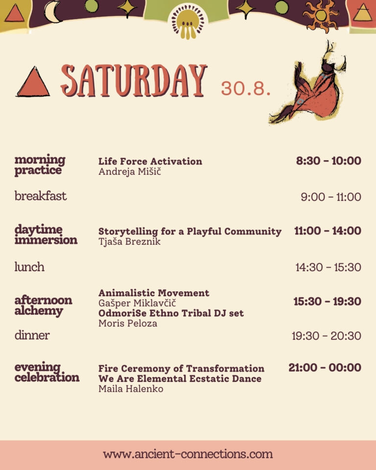 We will gather in the evening around the great sacred fire and enter a ceremony of letting go – using fire as the portal of transformation. Each will be invited to write outdated, limiting and unnecessary aspects/habits/ways of thinking of ourselves on a piece of paper. Then we will one by one throw the words into the fire and jump over it to purify the past and enter the following ecstatic dance with clean slate – stronger than ever.