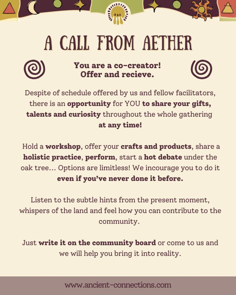 We are reserving the last evening of our Gathering to create a magical ceremony of embracing our authenticity and gifts, inviting anyone to show up and share. May it be solo concert, musical collaboration, reading your poetry, creating a fire show or dance performance…whatever wants to express through you is welcome 🙂